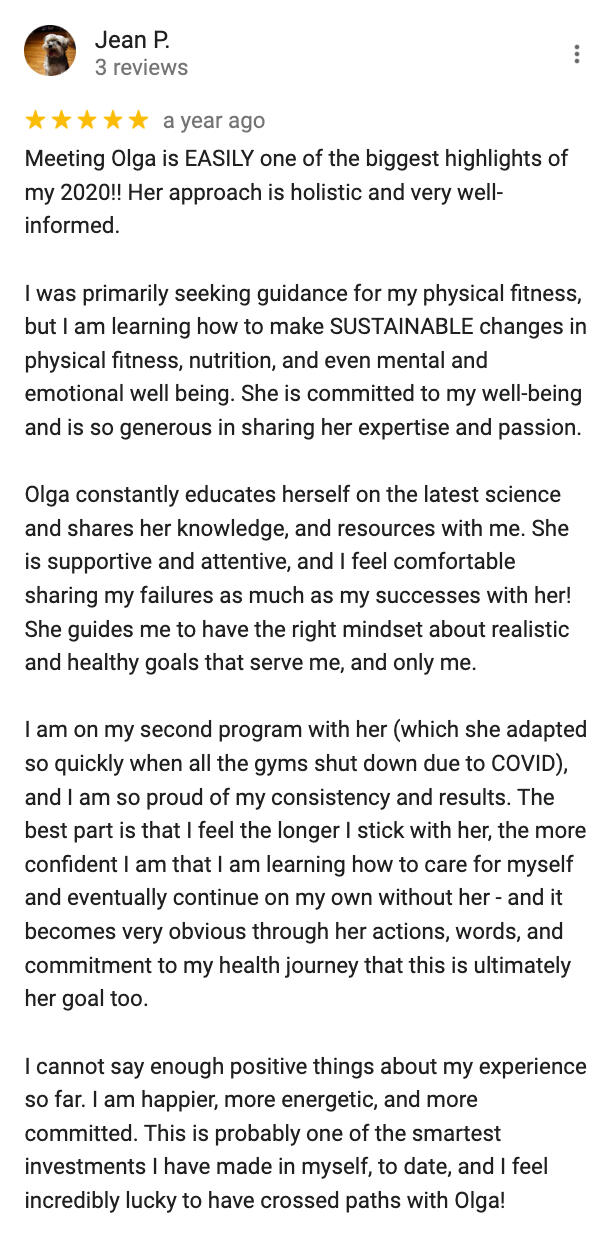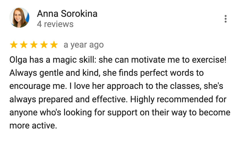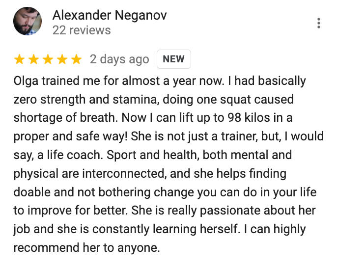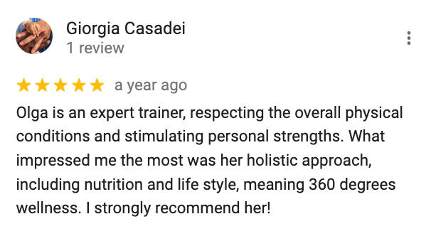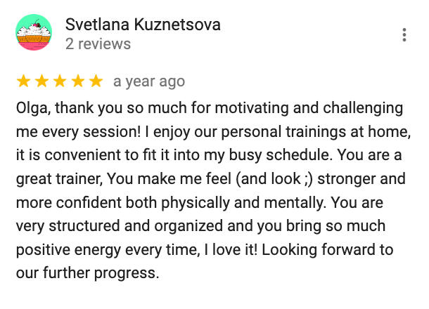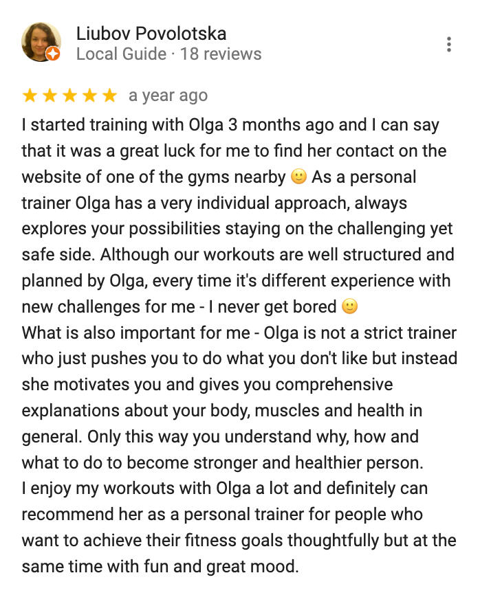 "Olga is not just a trainer, but, I would say, a life coach. Sport and health, both mental and physical are interconnected, and she helps finding doable and not bothering change you can do in your life to improve for better."