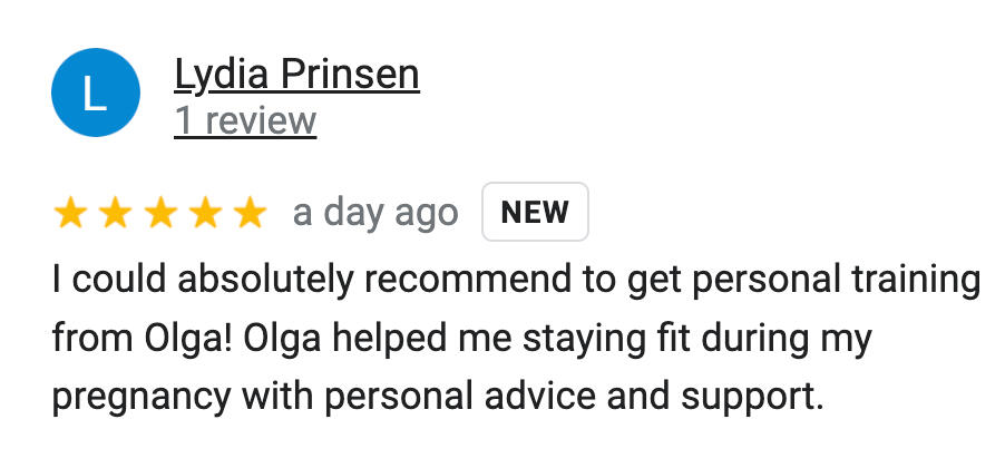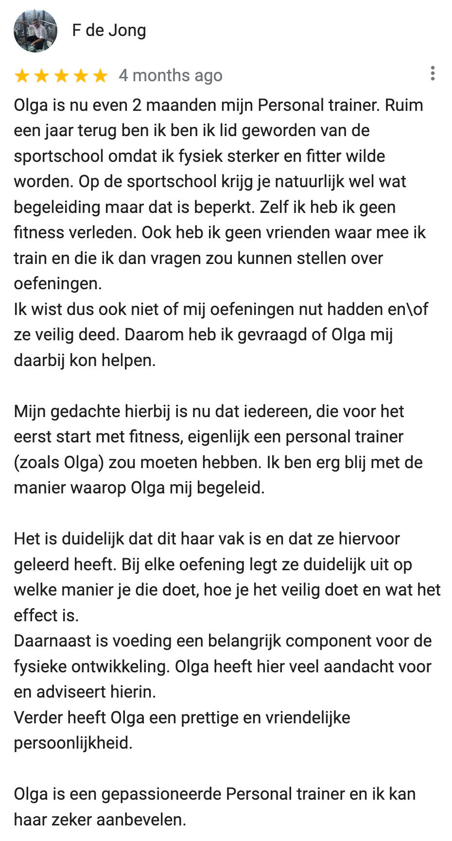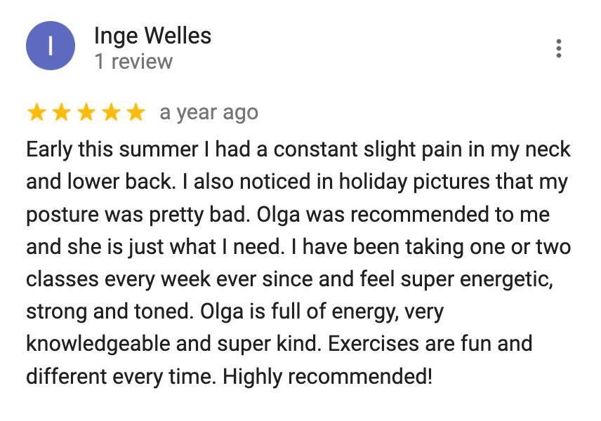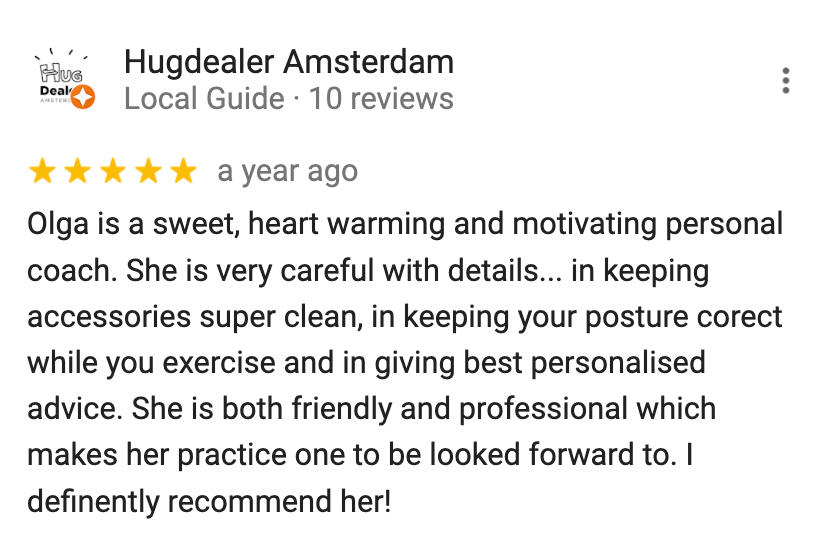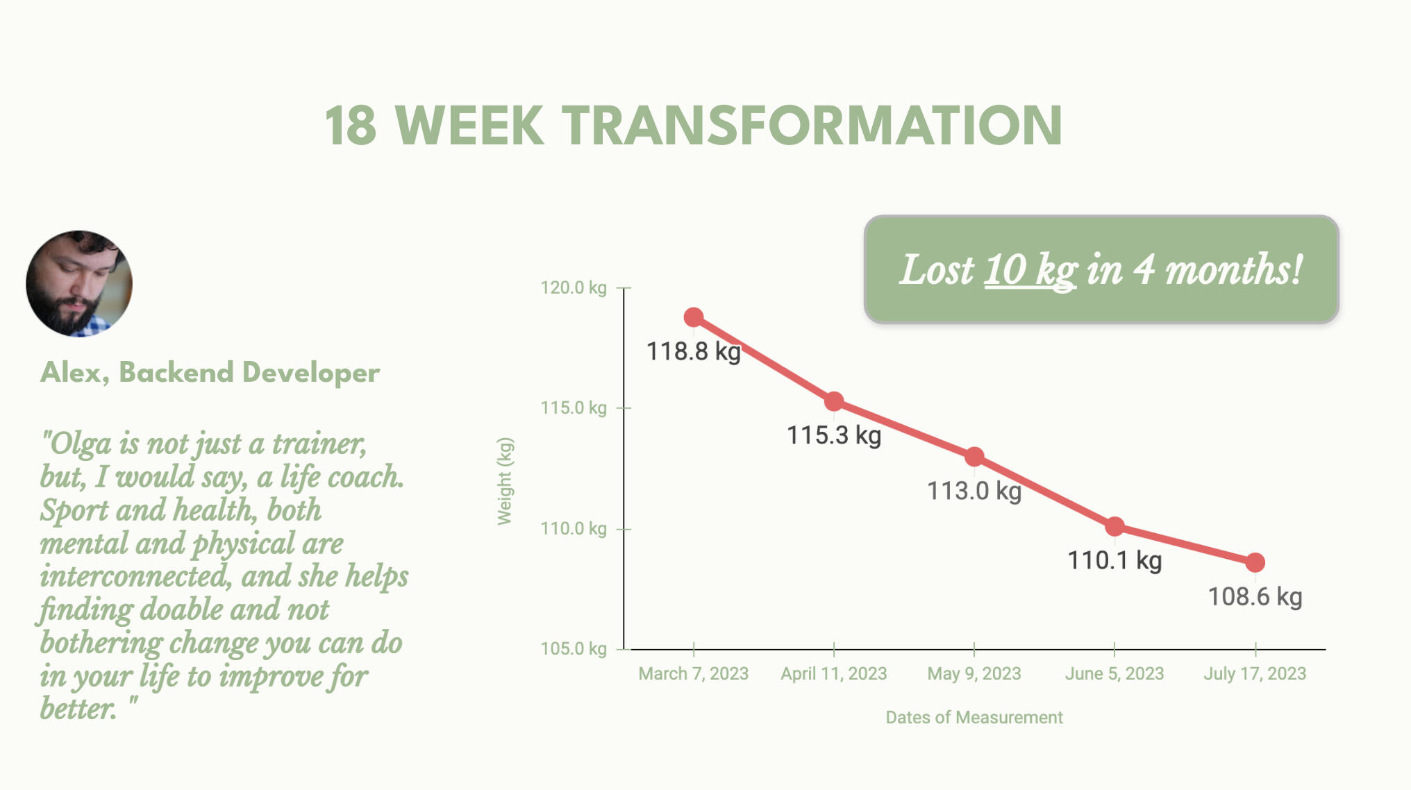 "Olga is not just a trainer, but, I would say, a life coach. Sport and health, both mental and physical are interconnected, and she helps finding doable and not bothering change you can do in your life to improve for better."