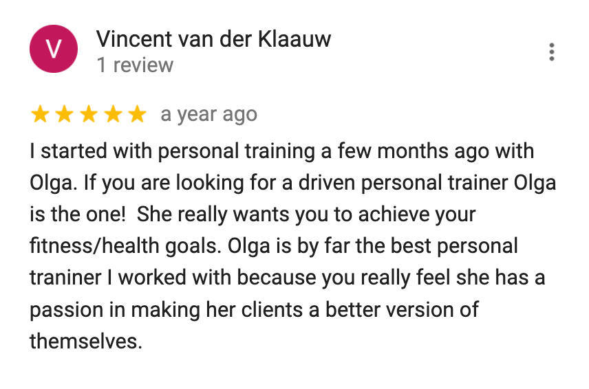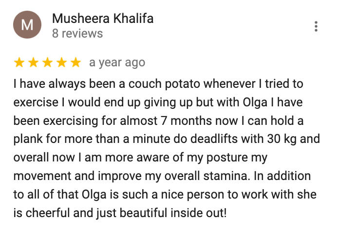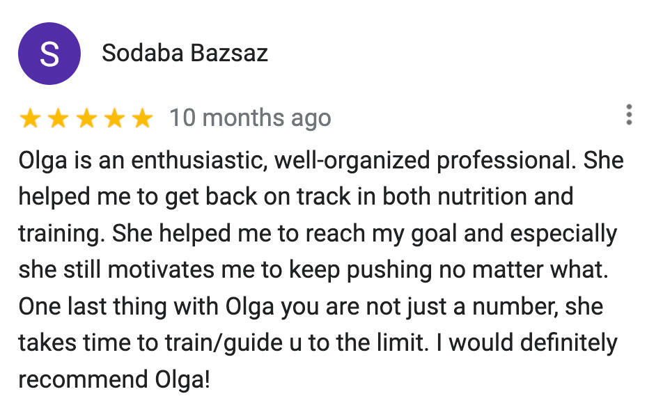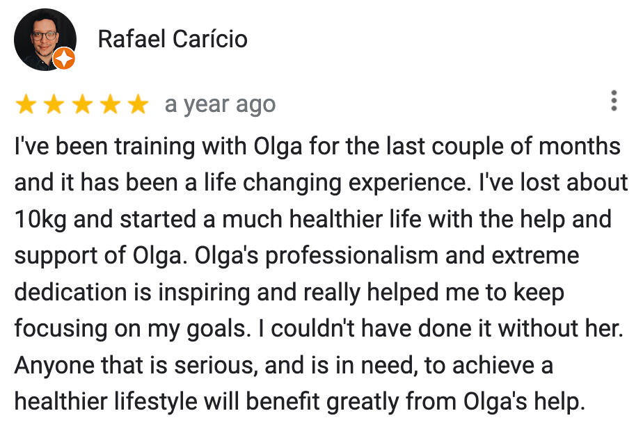 "I've been training with Olga for the last couple of months and it has been a life changing experience. I've lost about 10kg and start a much healthier life with the help and support of Olga."