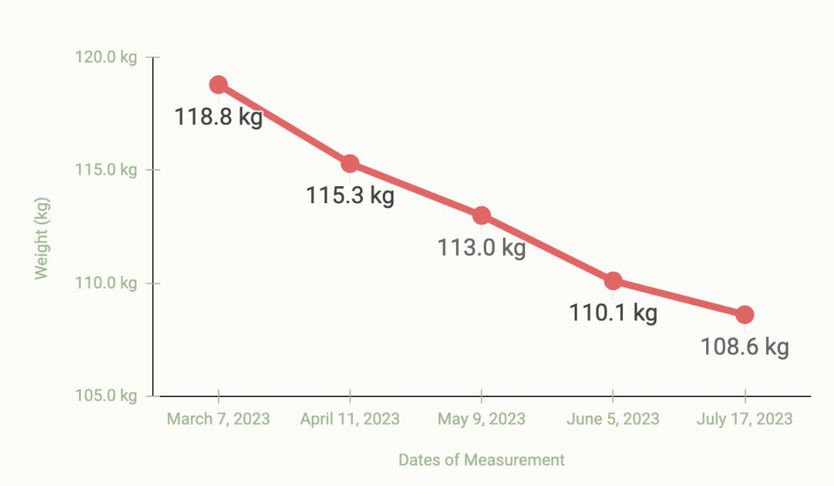 Alex has been working out with me once per week for over a year. He became significantly stronger and more capable. However, his body shape and size did not change. One day Alex decided to try a meal plan, and his weight has been steadily declining. Four months is, Alex keeps going and is close to his ideal weight. I'm very proud of Alex!