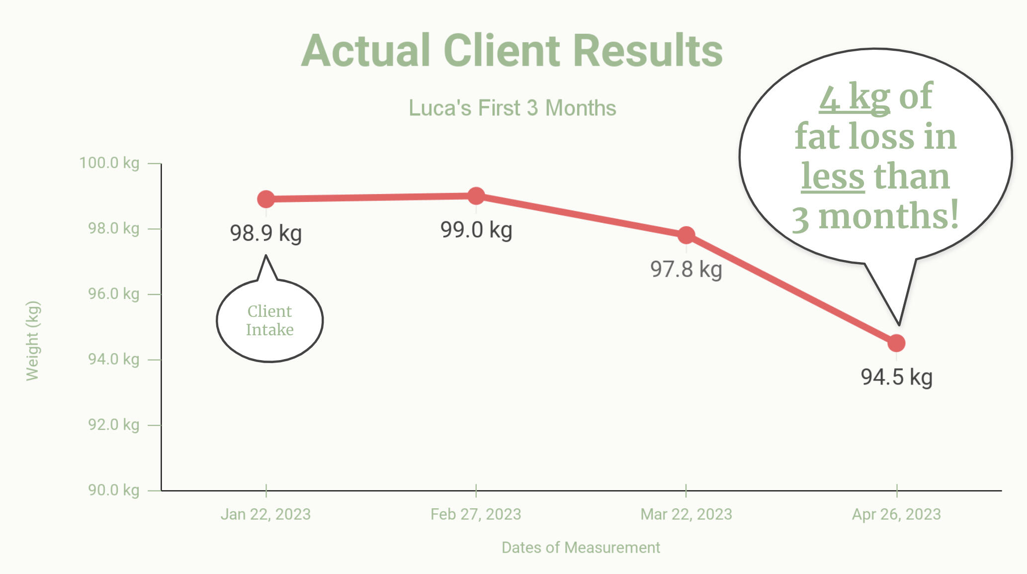 Luca lost 4 kg in the first 4 months working out together, three times per week, plus changes in his diet. Luca has become stronger and capable, and feels great in his stronger, leaner body.